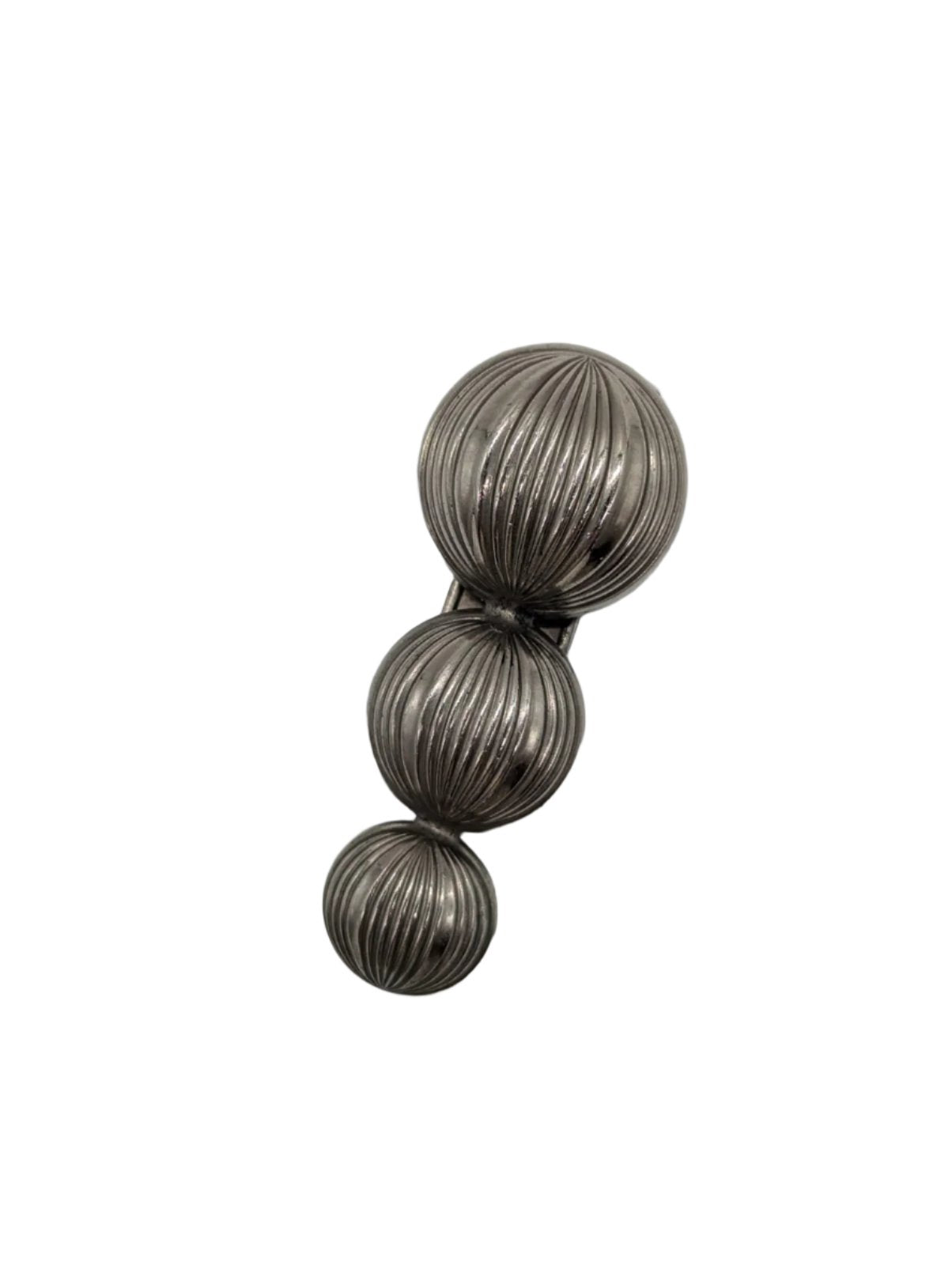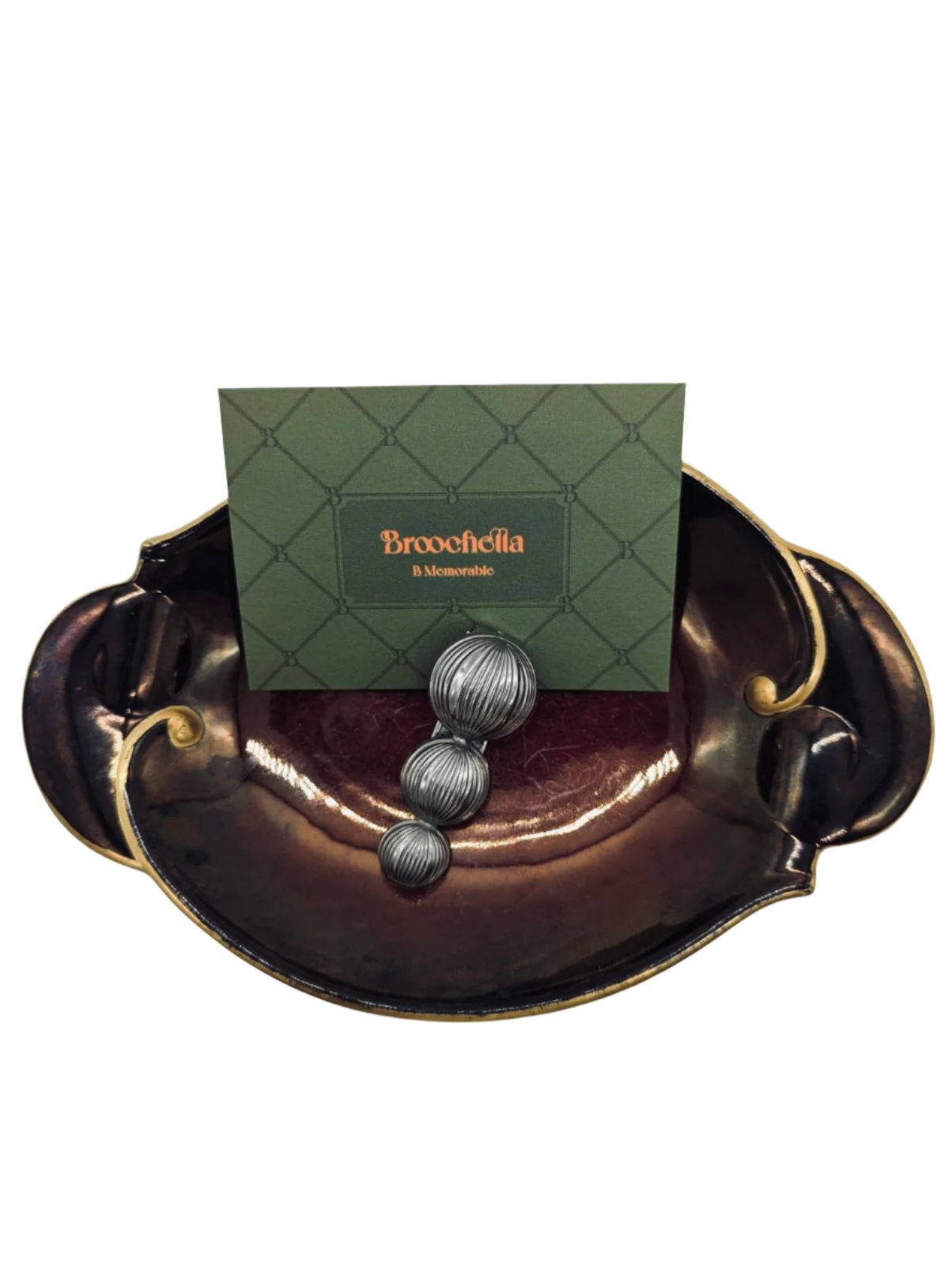 The "Trio of Edge" Brooch by Broochella is a sleek, modern statement piece with a bold, architectural design that channels the avant-garde style of high-end fashion houses like Balenciaga or Rick Owens. Its trio of graduated, ridged orbs delivers an industrial vibe, making this brooch edgy, cool, and undeniably unique.