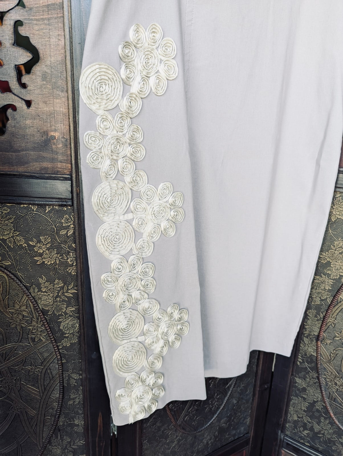 Details: Side floral appliqué, tailored pencil cut, back zip closure