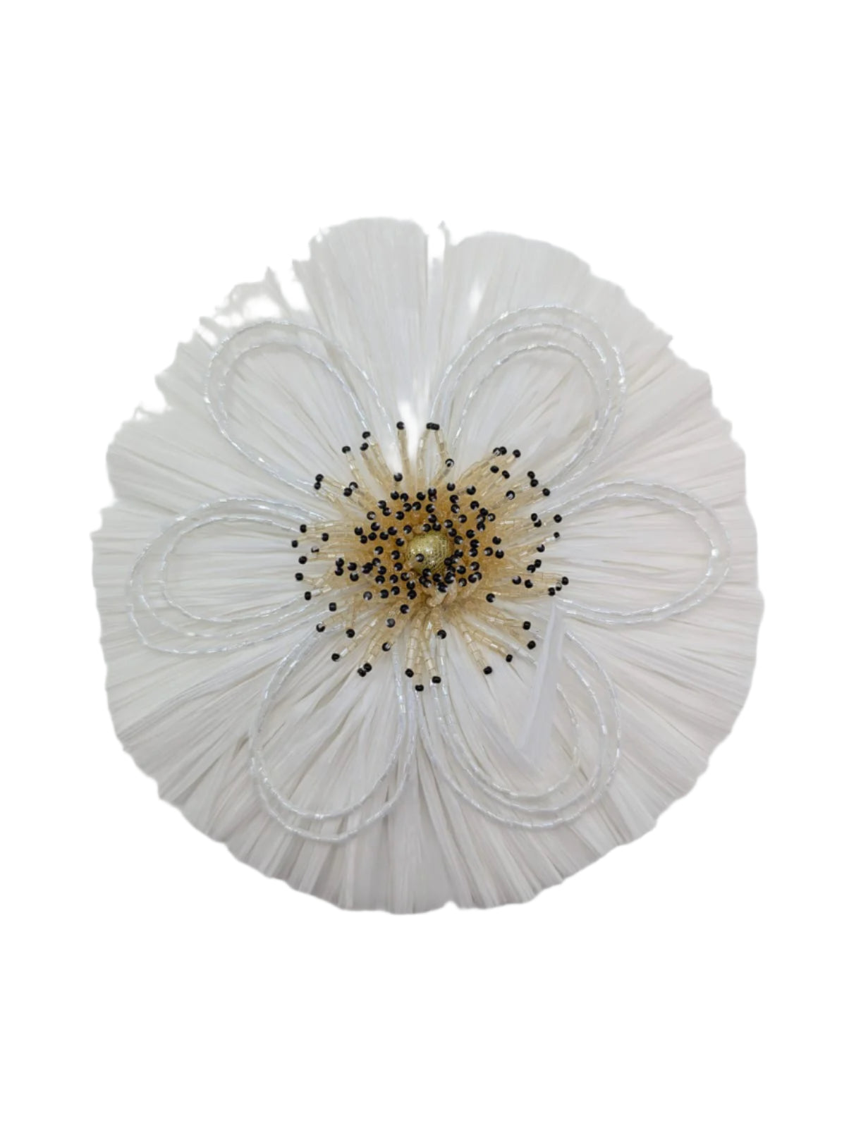 The "Raffia" bridal brooch is a modern take on natural elegance, designed to captivate with its unique texture and intricate craftsmanship. Featuring delicately layered raffia strands arranged into a blooming flower, this brooch is accented with shimmering beaded petals and a striking centre adorned with gold and black details. The "Raffia" is perfect for the contemporary bride who values individuality and style with a touch of artistry.
