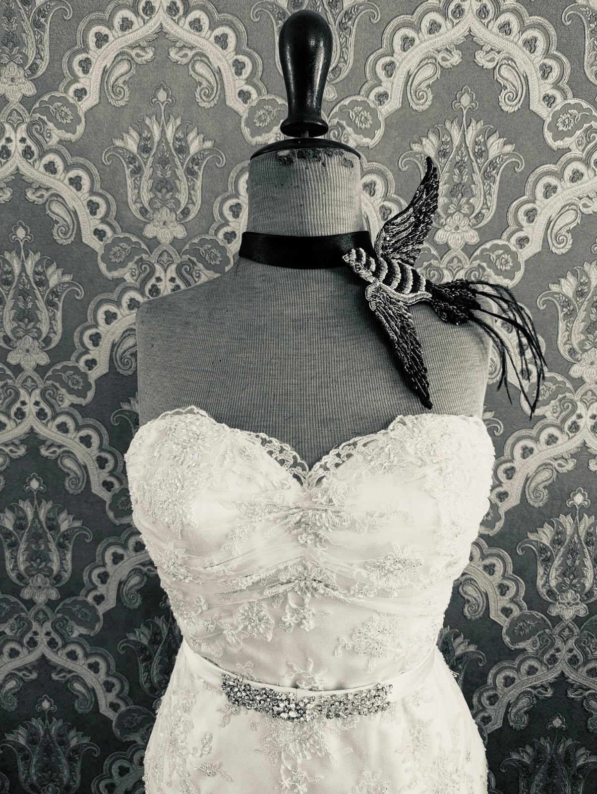 The "Swallow" Bridal Bird Brooch is a captivating piece that symbolizes love, hope, and new beginnings. Intricately hand-embroidered with shimmering sequins, metallic threads, and delicate beadwork, this brooch brings a sense of elegance and grace to your bridal look. The swallow’s outstretched wings and trailing feather-like tassels create a stunning sense of movement and freedom, perfect for the modern bride.