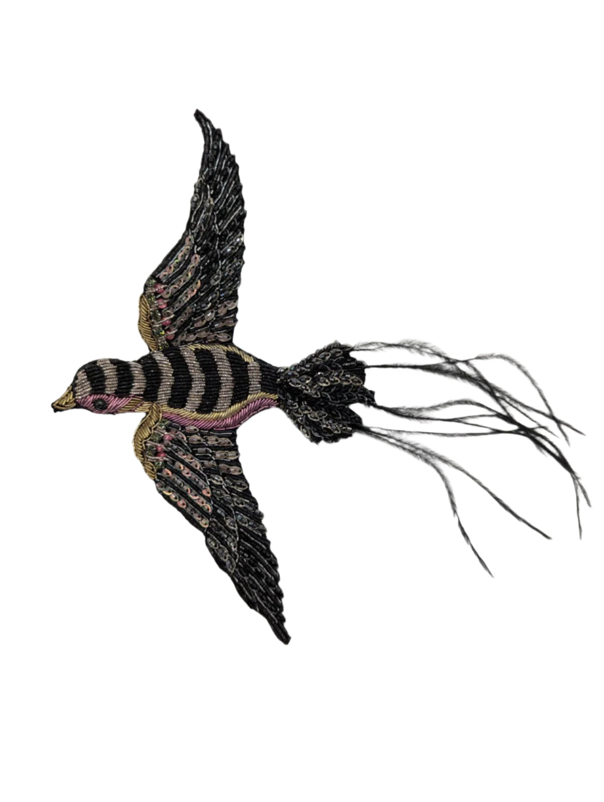Each "Swallow" brooch is meticulously handcrafted, ensuring slight variations that make every piece unique. Handle with care to maintain its delicate embroidery and tassel detailing.