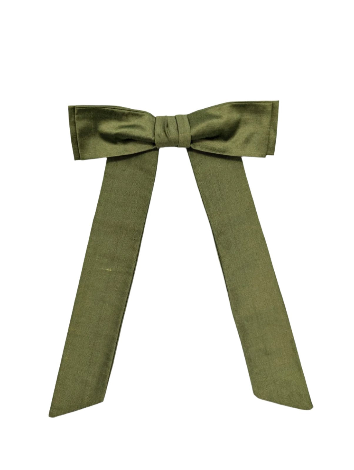 The natural texture of dupion silk gives the Alice Bow a unique charm, with its subtle sheen and crisp feel. This exquisite bow offers endless styling possibilities, effortlessly enhancing your look with a touch of sophistication and playfulness.