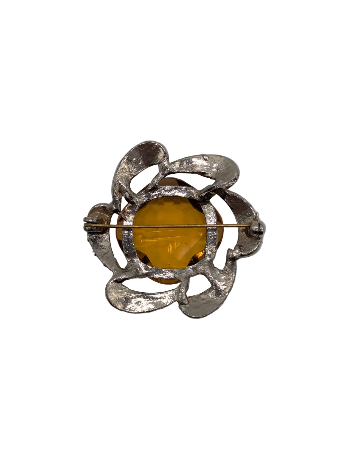 A striking statement piece from the mid-20th century, the Golden Marigold Vintage Brooch features a radiant faceted amber-yellow glass stone set at the centre of an organically sculpted silver-tone frame. Textured, petal-like arms curl around the gemstone, giving the brooch the appearance of a blooming metallic flower. Measuring 5 cm x 5 cm, this piece adds warm, luminous glamour to coats, dresses and eveningwear.