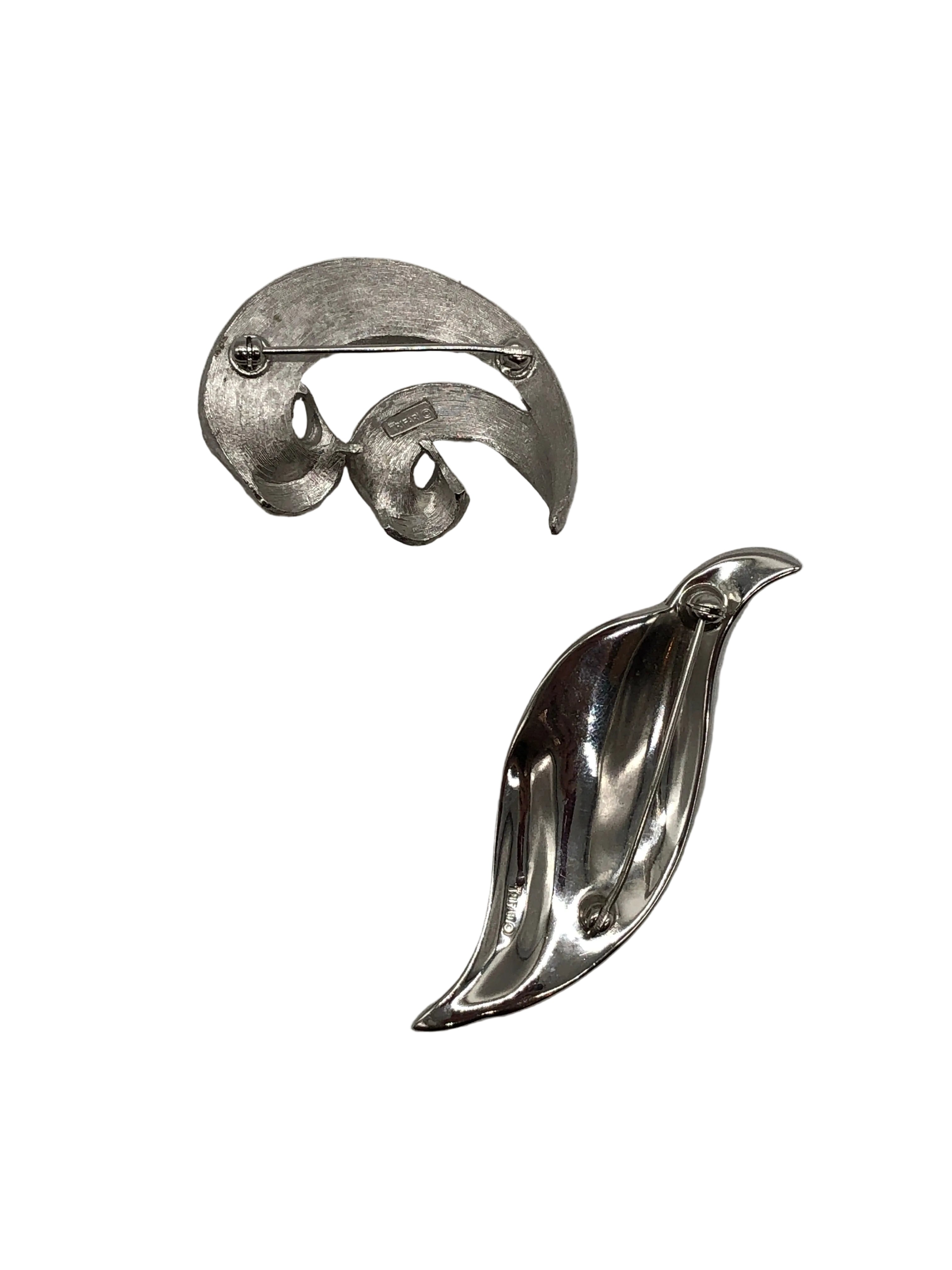 Elegant and sculptural, the Trifari Silver Tone Vintage Brooch Set is a striking pair of vintage silver-tone brooches that embody the sleek sophistication of mid-century costume jewellery design. Created by the renowned American jewellery house Trifari, these brooches showcase the refined craftsmanship and modernist aesthetic that made the brand one of the most celebrated names in vintage jewellery.